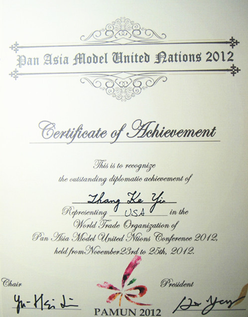2012年11月23日至25日,由台湾大学主办的第四届泛亚洲模拟联合国大会在台湾台北市张荣发会议中心举行。我院传播学系本科生张可一代表厦门大学模拟联合国协会参会。在为期三天的四场会议中,张可一作为美国代表发挥出色,在百余名代表中脱颖而出,获得委员会最高奖项――最佳代表奖。