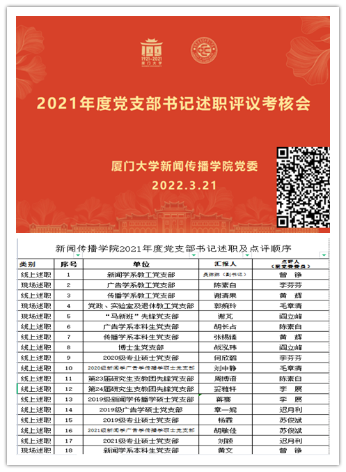 3月21日,新闻传播学院召开2021年度党支部书记述职评议考核会,学校基层党建工作联络员潘宝柱,学院党委委员、各师生党支部书记出席。评议会由院党委副书记李芬芬主持,会议采取线上线下相结合形式进行。