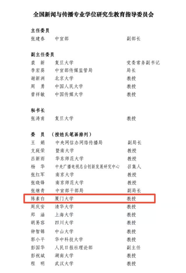 近日,国务院学位委员会、教育部、人力资源社会保障部联合印发《关于全国金融等30个专业学位研究生教育指导委员会换届的通知》,公布了新一届专业学位研究生教育指导委员会成员名单,我院副院长陈素白教授当选全国新闻与传播专业学位研究生教育指导委员会委员。