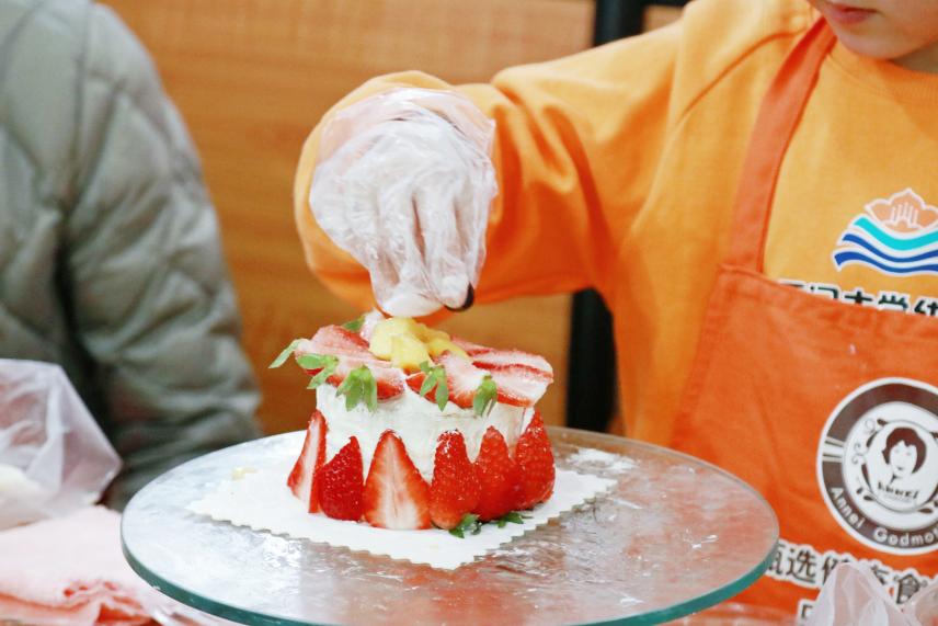 蛋糕店的师傅为大家详细讲解了制作蛋糕的步骤,大家充分发挥动手能力和想像力装扮属于自己的蛋糕,通过抹奶油、装饰水果,对蛋糕进行更丰富、更深层的加工,赋予蛋糕以独特美丽的外形。