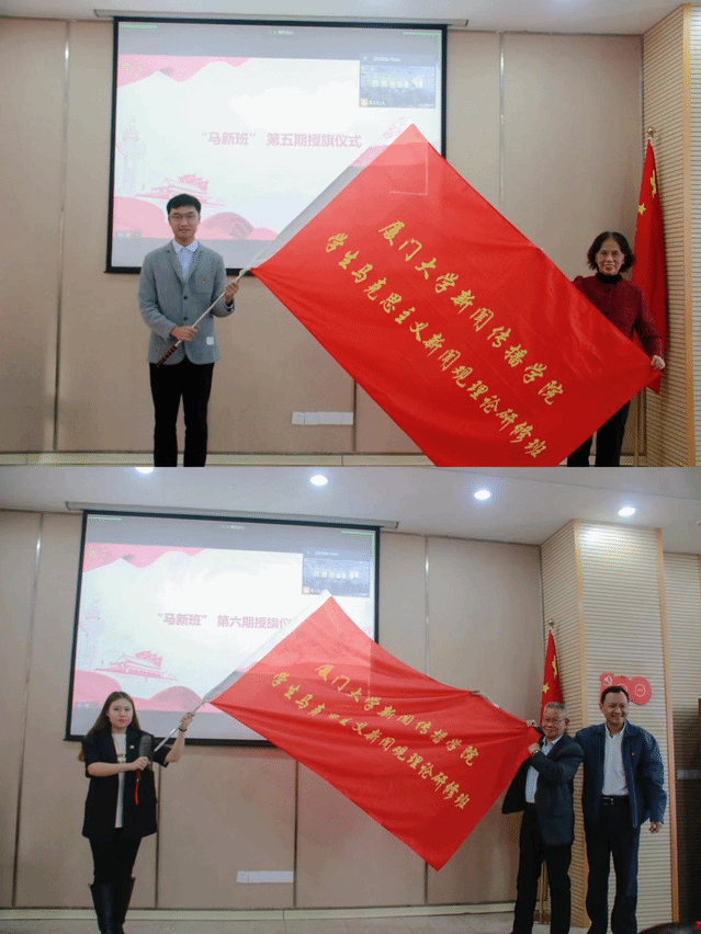 陈力文、潘宝柱、李峰为“马新班”第五期、第六期授旗,仪式在《国际歌》合唱声中落下帷幕。仪式后,厦门大学马克思主义学院石红梅教授为“马新班”做《不忘初心 牢记使命——学习贯彻党的十九届六中全会和决议精神》专题辅导报告。