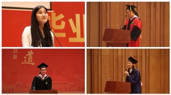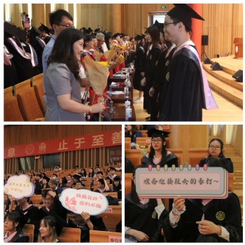 人民网编委、策划联动中心主任、人民视频董事长,我院2009届硕士毕业生陈星星学姐分享了她的学习及工作经验,表达了她对学弟学妹们的殷切期盼。教师代表黄含韵老师希望同学们既志存高远又脚踏实地,做个温暖而勇往直前的人。本科生毕业生代表冯韦隽和研究生代表刘方洁上台,向老师们的教诲、父母的养育、同学的陪伴表达了由衷的感谢。伴随着新声合唱团悠扬的歌声,毕业生们为学院教师、党政、后勤老师们准备了一个惊喜,用KT板向老师传达了想对老师说的话。毕业生为老师敬献玫瑰花和向日葵,并鞠躬致谢。