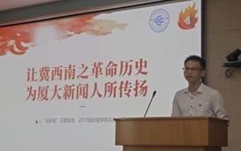 校团委副书记梁振伟在云南篇的分享中认为,新闻人要有沾泥土、带露珠的“脚力”,辨得清、判得准的“眼力”,政治敏感的“脑力”和百姓爱看爱听的“笔力”。博士生郭一鸣讲述了在云南德宏挖掘南洋华侨机工、厦大校友白雪姣投笔从戎、冒着炮火在滇缅公路运输抗战物资的英勇事迹和缅籍华人赵红仙老师教授中缅双语、传播中华文化的动人故事。郭一鸣认为,厦大人应当传承老一辈“爱国”、“革命”、“自强”、“科学”的精神,用青春告白祖国,用汗水铸就未来。