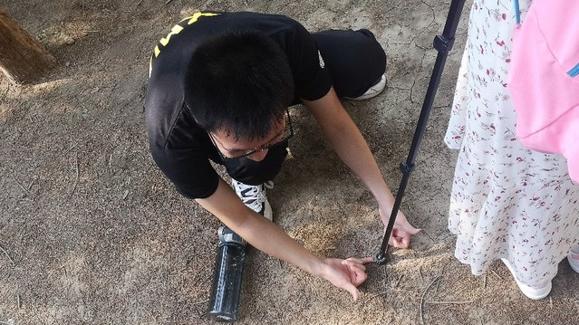 由于闽冀之间路程遥远,携带设备有限,遇到画面不稳定、跟焦不清晰等问题。实践队队员本着“没有条件创造条件”的精神,找到解决之道:两名成员同时拍摄,一人扶相机调焦、一人盯显示屏控制节奏,其他人则关注演员的节奏与配合。经过多次演练,默契十足。此外,由于陵园场景地势不平,脚架上无法调平画面,男主演便主动上阵,用手指垫高脚架来灵活调整高低。