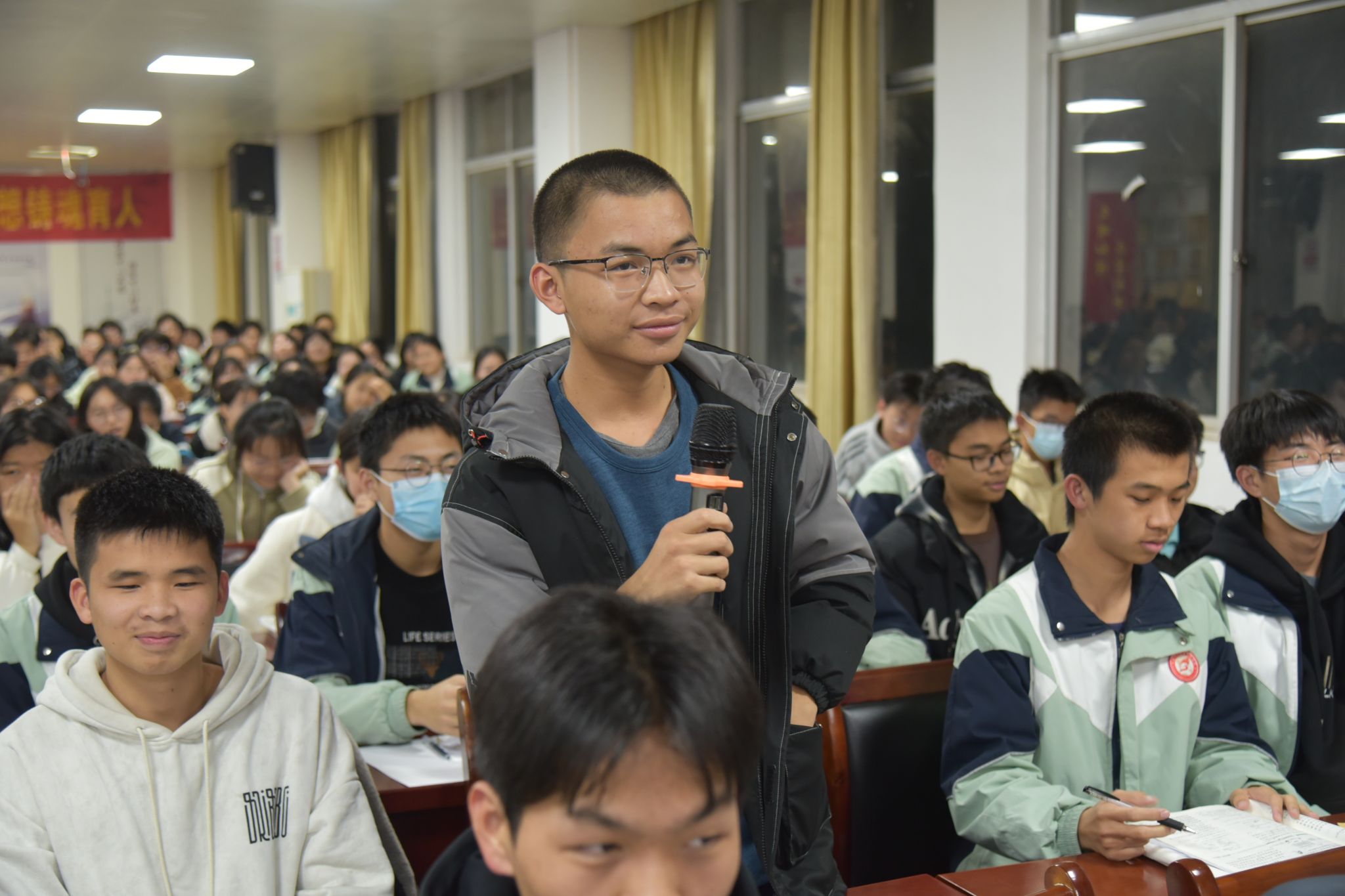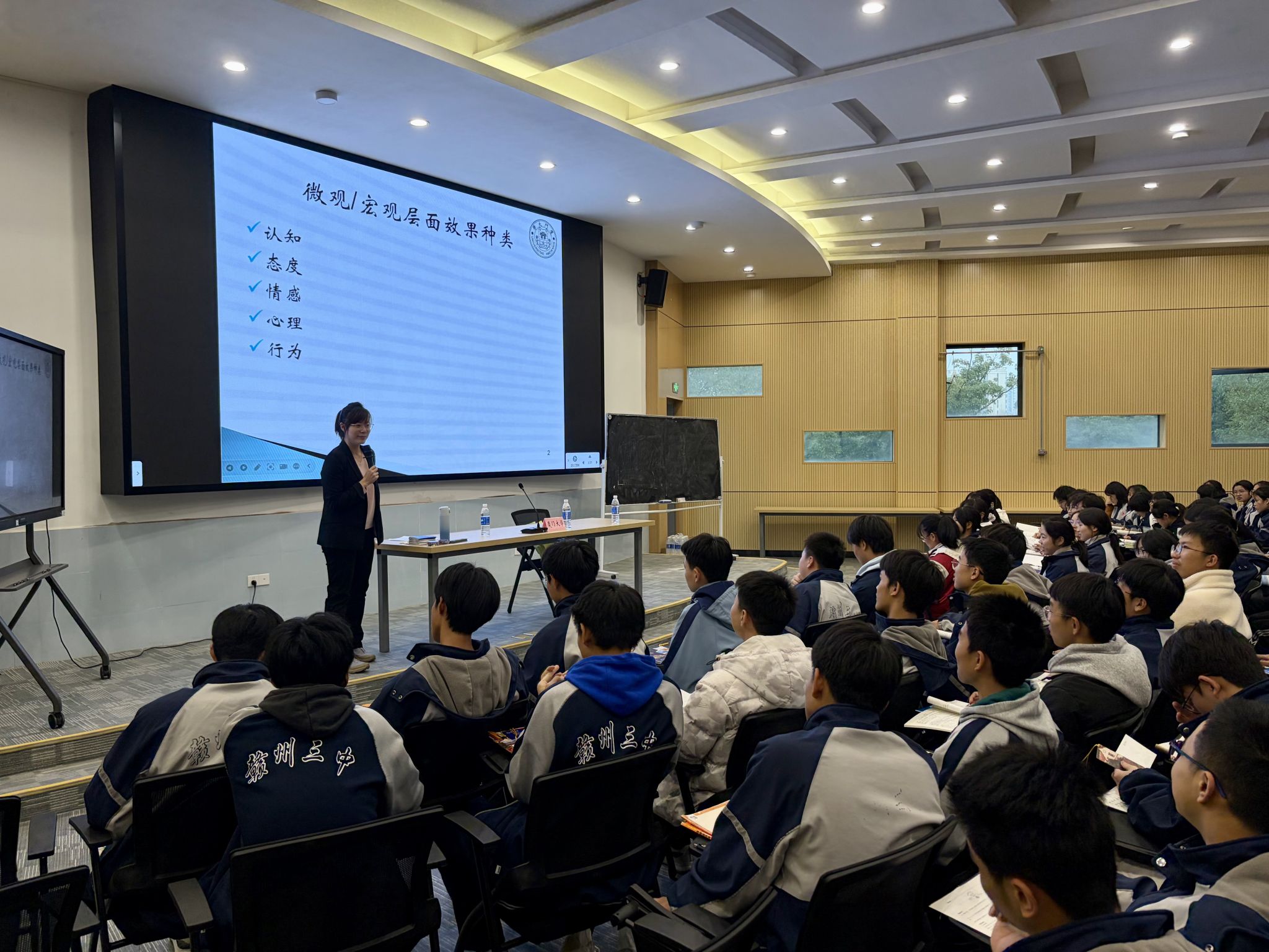 随后,黄老师作专题讲座,深入浅出地为同学们讲解了传播效果的概念与研究,引导同学们观察与思考身边的传播现象,展现新闻传播学科的魅力与时代价值。讲座结束后,同学们意犹未尽,围绕讲座内容、新传专业报考等进行积极提问,黄老师给予细致解答,为同学们的未来规划提供真挚建议。最后,赣州三中教务主任王老师对本次活动进行总结,并鼓励在座同学以厦门大学为目标,脚踏实地、奋力拼搏。