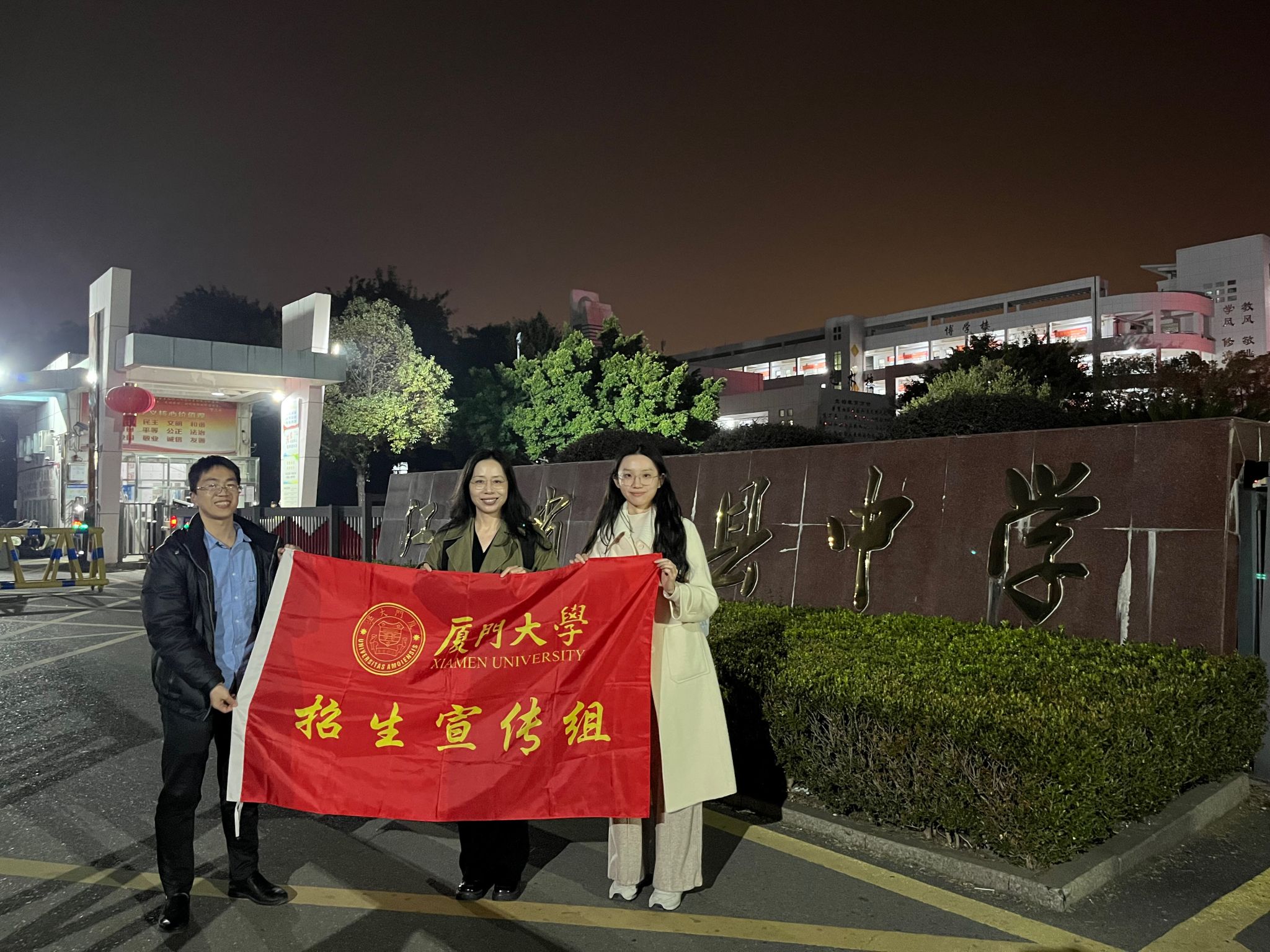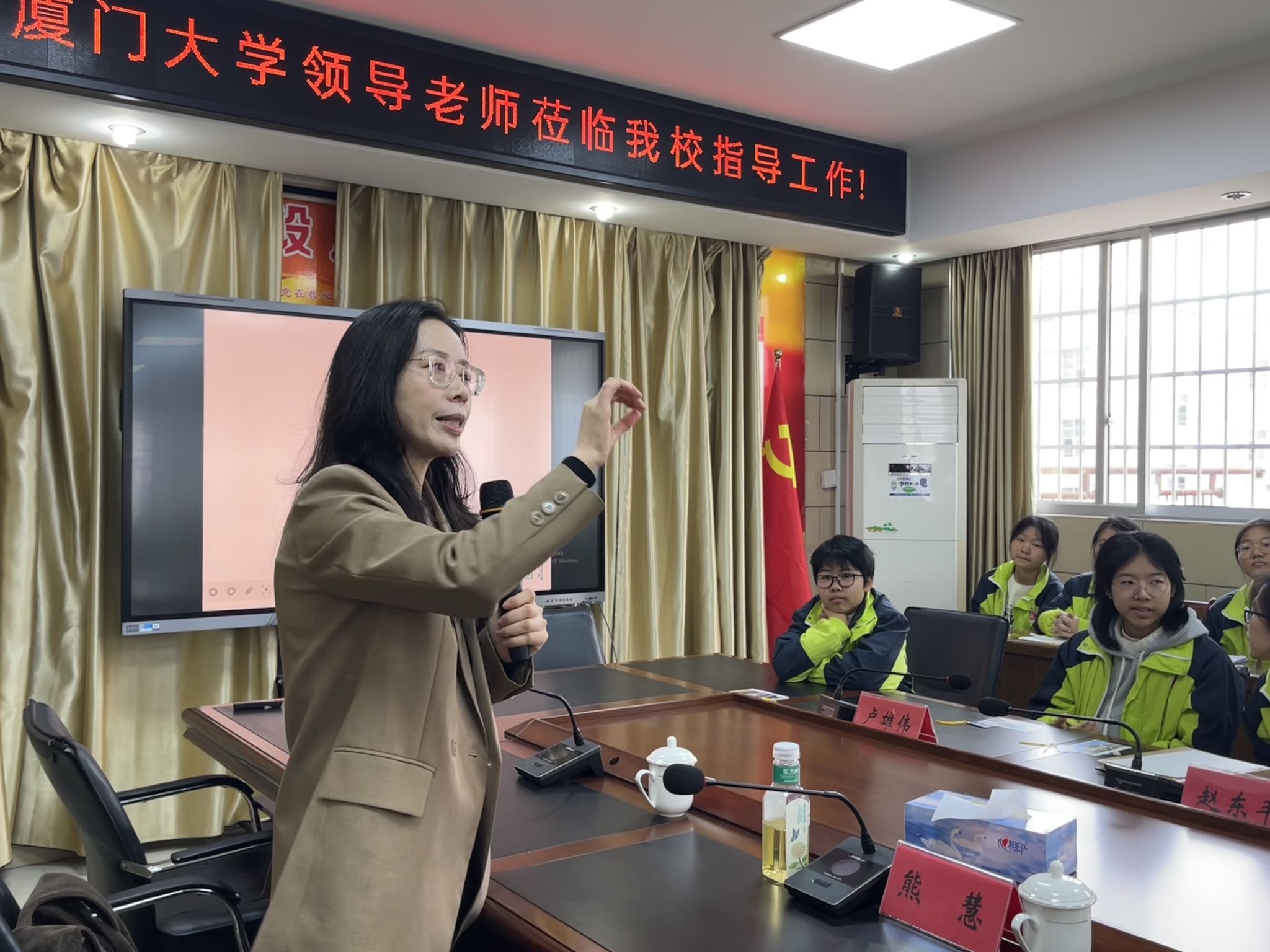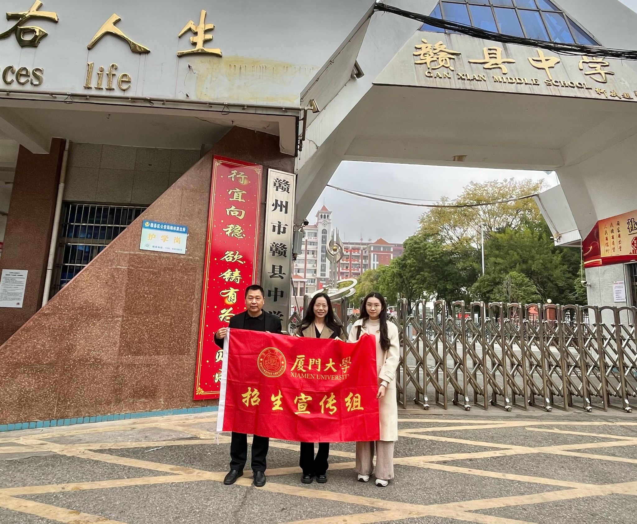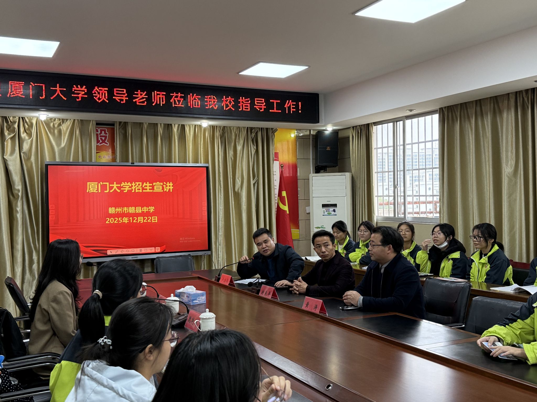 2025年12月21日至23日,厦门大学江西招生宣传组赴江西省赣州市开展系列招生宣传活动。宣传组先后走访赣县中学南校区、赣州中学、赣州三中、赣县第三中学四所中学。本次工作组由新闻传播学院副院长、传播学系教授熊慧带队,成员包括传播学系副教授黄含韵、物理科学与技术学院副教授卢普顺,以及新闻传播学院硕士研究生魏艳鸽、叶莹。本次招生宣讲活动旨在深化与赣州重点中学的交流合作,向广大师生及家长全面展示厦门大学的办学特色、学科优势与育人成果。