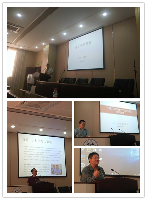 本次工作会由林升栋副院长主持,由邹振东、苏俊斌、曹立新/林升栋和谢清果等几位老师作为团队代表做了四个研究方向的报告。苏俊斌团队:《数据驱动的新闻传播实证研究小组》;谢清果团队:《华西文明传播与文化话语权创新团体》;邹振东团队《新闻传播学院学科建设团队》;曹立新/林升栋:《讲好中国故事》。
