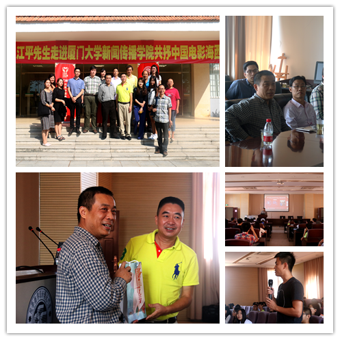 讲座开始之前,江平导演一行与厦大新闻传播学院师生在新闻楼会议室,就中国电影业现状、当代传统媒体面临的困境以及实验式教学方法等问题,进行了专业且深刻的交谈和讨论。华语视艺节组委会委员、秘书长邢新彦,中华时报总编江俊涛,厦门大学新闻传播学院党委书记郑树东,党委副书记林盛铨、聂鑫,新闻学系教授邹振东、岳淼、厦门大学党委宣传部副部长、新闻学系副教授苏俊斌、实验中心主任洪强、副教授迟月利、学院团委书记戴蓥等共同出席了本次座谈会。