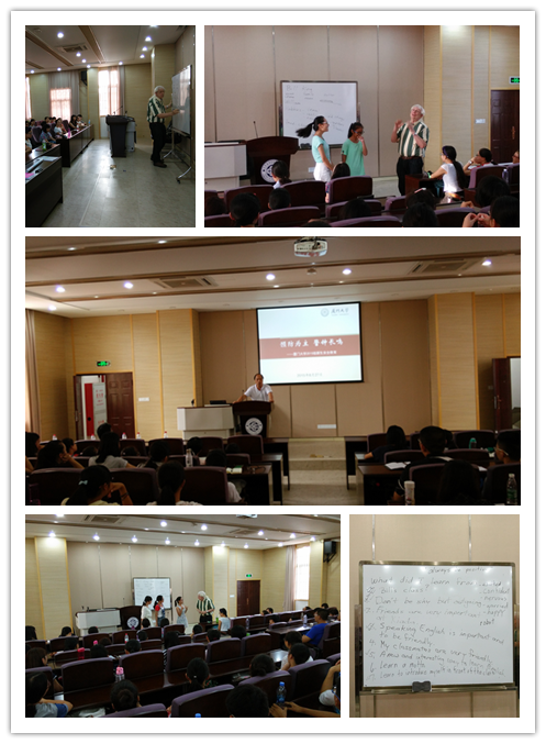 为了让即将参加新生英语分级考试的同学们熟悉英语语言环境,27日下午,学院继续邀请加拿大籍外教Bill老师前来给新生们上了一堂生动有趣的英语课。耄耋之年的Bill老师从每个人的英文名字入手,将纯正易懂的英语娓娓道来。紧接着,Bill老师鼓励新生们自告奋勇,结对子登台用英语介绍自己,介绍家乡,相互交流近期的学习生活体验与感悟,Bill老师自己则在一旁不时地纠正同学们的发音和措辞。不少同学下课后仍围着Bill用英语交流,纷纷表示通过Bill老师的介绍,喜欢上了英语,并受益匪浅。