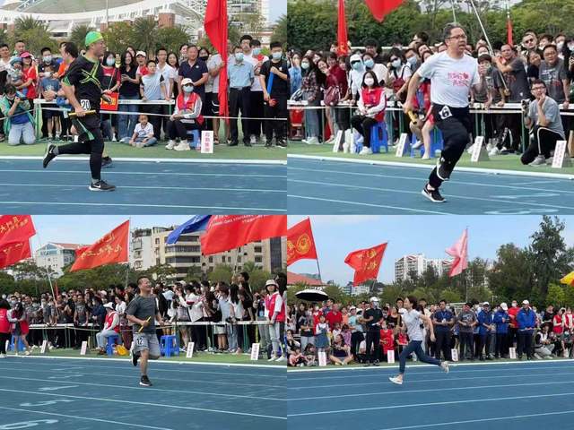 教职工队伍率先出发,在志愿者的带领下迈着从容而自信的步伐来到跑道两侧候场,摩拳擦掌,跃跃欲试。赛前大家积极准备练习,来到赛场上后各个斗志昂扬。裁判示意,比赛开始。在跑道两侧学生们的阵阵摇旗呐喊声中开始了紧张而激烈的竞赛。新传教职工们把握节奏,稳中求进,以默契的接棒配合,强劲的冲刺爆发力,充分彰显出我们新闻传播学院“‘新’火相传,‘闻’以载道”的激情与热度。赛程过半,宣长春老师不慎摔倒,大家的心都骤然收紧,但宣老师没有停留,眼镜也顾不上捡起,就迅速站起冲向下一位同伴交接接力棒,那一刻的掌声是对老师们永不放弃精神的鼓励。最后一棒冲过终点,那一刻的掌声是对我们成功时的喝彩!结束后,老师们跟记者笑谈,“不是小组第八,我们就很满意了!”“之前跑得不多,今天一试,没想到自己可能还有点跑步的天赋!”