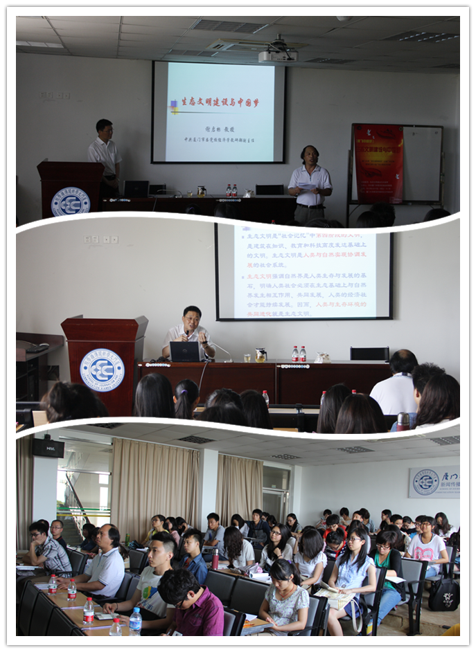 为深入学习宣传贯彻党的十八大精神,推动社会主义核心价值体系建设,培育校园正风正气和大学生的社会责任意识,提升大学生的学术应用与创新实践能力,5月10日下午,由厦门大学党委宣传部、学生工作部(处)、教务处、校工会、校团委以及新闻传播学院联合举办的厦门大学“讲文明树新风”公益广告征集活动暨第五届公益广告大赛系列讲座之“生态文明建设与中国梦”,在新闻楼报告厅隆重开讲,中共厦门市委党校经济学教研部副主任谢启标老师为师生们带来了一场知识的盛宴。讲座由新闻传播学院党委副书记林盛铨主持。