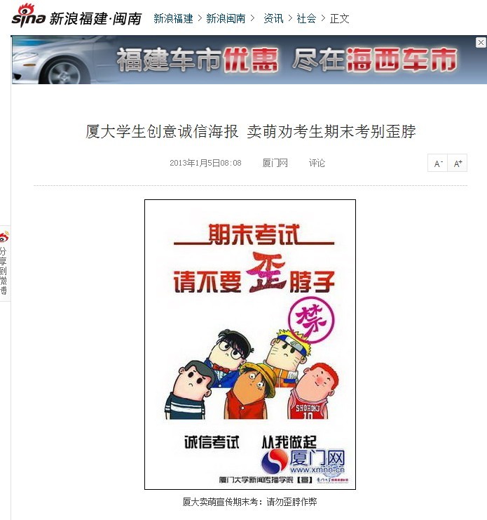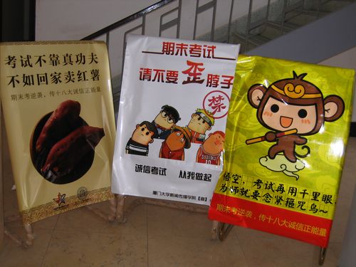 学院各级学生干部也纷纷动员,在各党支部、团支部和班级中开展宿舍安全检查和期末复习帮扶活动,组织学习《厦门大学考试纪律及违规处理办法》、《厦门大学学生违纪处分规定》和《学生违纪案例选编》,倡议同学们认真开展期末复习,自觉维护考试诚信。院学生会创新思维,结合时下流行的“歪脖照”等风格,制作了别开生面的期末考试诚信教育系列宣传海报,得到了广大同学的热情关注和大量微博转发,并得到《厦门日报》社的关注和采访,增加了宣传教育的生动性、趣味性和广泛性。