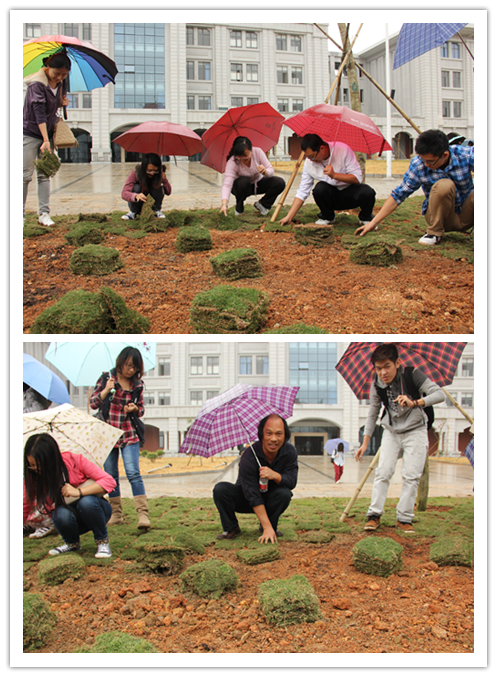 细雨虽无声,绿草知情意。11月17日上午的翔安校区细雨绵绵,主楼1号楼旁的绿化带前,80多名学生熟练地将一块块草皮铺在绿化带的泥土上,一会的功夫,绿油油的草坪就“长”出来了。看着自己的劳动成果,一名同学笑着说:“原本以为党校结业式的参观实践活动要被大雨搅黄了,但是毛毛细雨反倒让大家热情高涨。看着自己的劳动成果,想着将来郁郁葱葱的草坪,我们也为翔安校区的建设出了一把力,心里挺美的!”