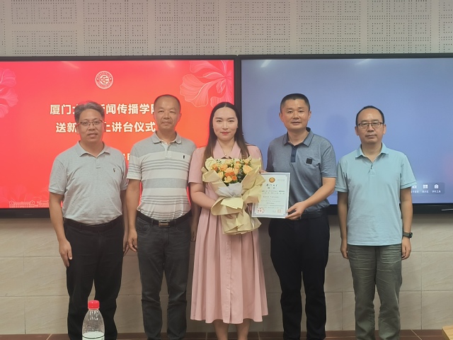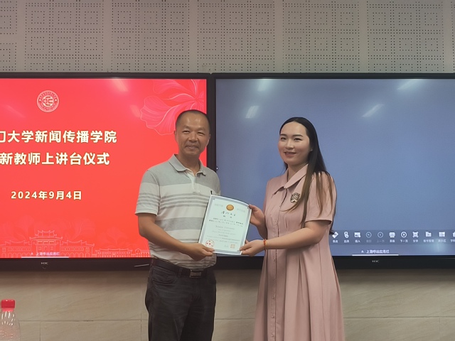 9月4日下午,在囊萤楼106教室,《出版与数字出版概论》课程正式上课之前,新闻传播学院为首次登上讲台的新闻学系年轻教师王嘉昀举办了简单而又正式的仪式。仪式由院党委书记曾铮主持。院长林升栋、院党委副书记黄辉、副院长苏俊斌与2022级国际新闻与传播专业本科生共同见证这一特殊时刻。