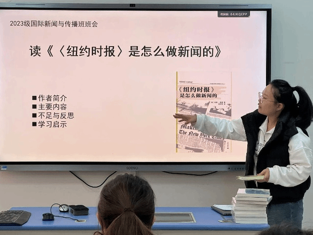 班主任张雪老师结合专业特色,与大家共同学习了《< 纽约时报>是怎么做新闻的》一书。张老师带领同学们探讨了新闻生产的价值观念及其变迁。她鼓励同学们将课程学习、实习实践、调查研究互相贯通、有机结合起来。