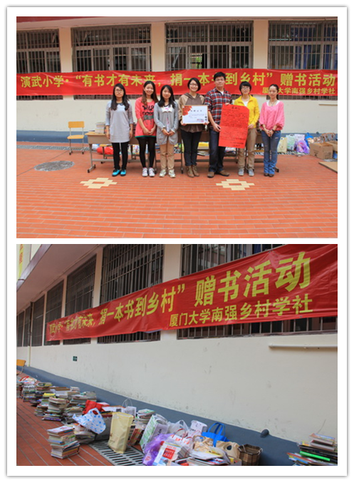 “有书才有未来,捐一本书到乡村”。11月20日下午,由新闻传播学院10、11级本科生党支部和厦门大学南强乡村学社共同主办的品牌志愿服务――“乡村图书馆”项目,赴厦门市演武小学成功举办募书活动。