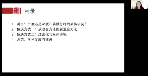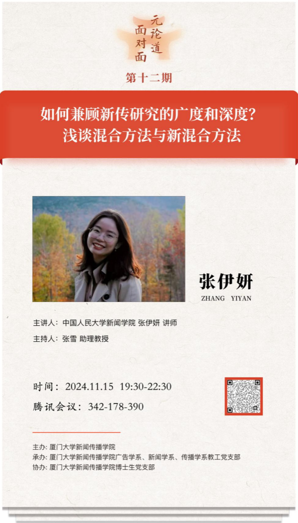 11月15日,“元论道·面对面”青年学术沙龙第12期在线上成功举办。本次活动的嘉宾是来自中国人民大学新闻学院的张伊妍讲师,主题为《如何兼顾新传研究的广度和深度?浅谈混合方法与新混合方法》。本场讲座吸引了校内外约120位师生参与。厦门大学新闻传播学院助理教授张雪主持本场学术沙龙。