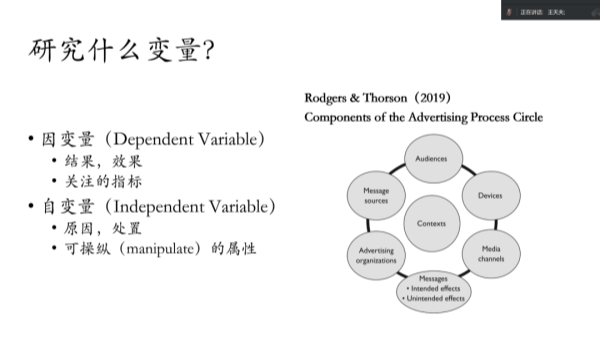 王天夫首先讲述了广告学研究范式,指出广告学作为变量学科的一个重要贡献,是指出某些变量和情形可能对一些更宏观通用的理论进行中介、调节、证实(证伪)。在广告领域当中,有很多的研究变量及相互关系可以探讨和研究。例如计算广告的核心问题是为一定环境中的一定用户与合适广告之间寻找最佳匹配。同时,讲述了讯息变量、受众变量的测量方式以及变量间的影响关系。
