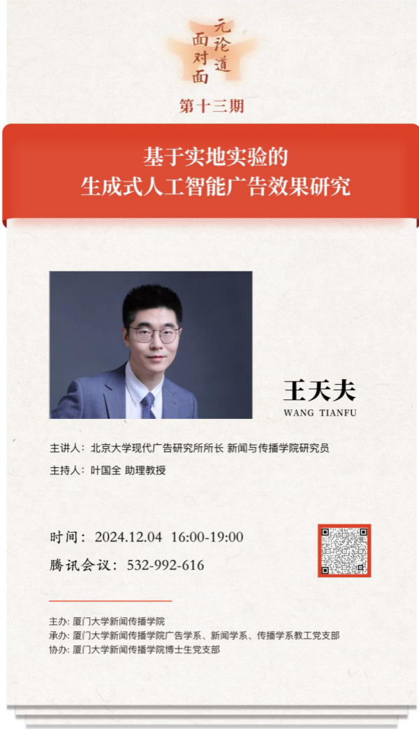 12月4日,由厦门大学新闻传播学院主办、厦门大学新闻传播学院广告学系、新闻学系、传播学系教工党支部、厦门大学新闻传播学院博士生党支部承办的“元论道·面对面”青年学术沙龙第13期线上讲座成功举办。讲座以“基于实地实验的生成式人工智能广告效果研究”为主题,主讲人为北京大学新闻与传播学院研究员、北京大学现代广告研究所所长王天夫老师,讲座由叶国全助理教授主持,相关硕博研究生参会。
