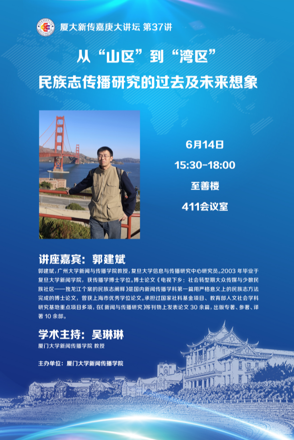 6月14日下午,广州大学新闻与传播学院教授,复旦大学信息与传播研究中心研究员郭建斌教授做客厦门大学新传嘉庚大讲坛,在至善楼411会议室举办了题为《从“山区”到“湾区”——民族志传播研究的过去及未来想象》的学术讲座。本次讲坛由新闻学系吴琳琳教授主持。