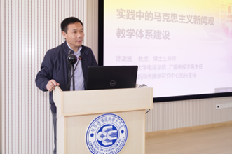 中国传媒大学电视学院广播电视学系主任涂凌波教授在《实践中的马克思主义新闻观教学体系建设》主旨演讲中,阐述了马克思主义新闻观在新闻传播学教育中的核心地位与重要性,并分享了中国传媒大学在教学体系建设方面的积极探索与成效。