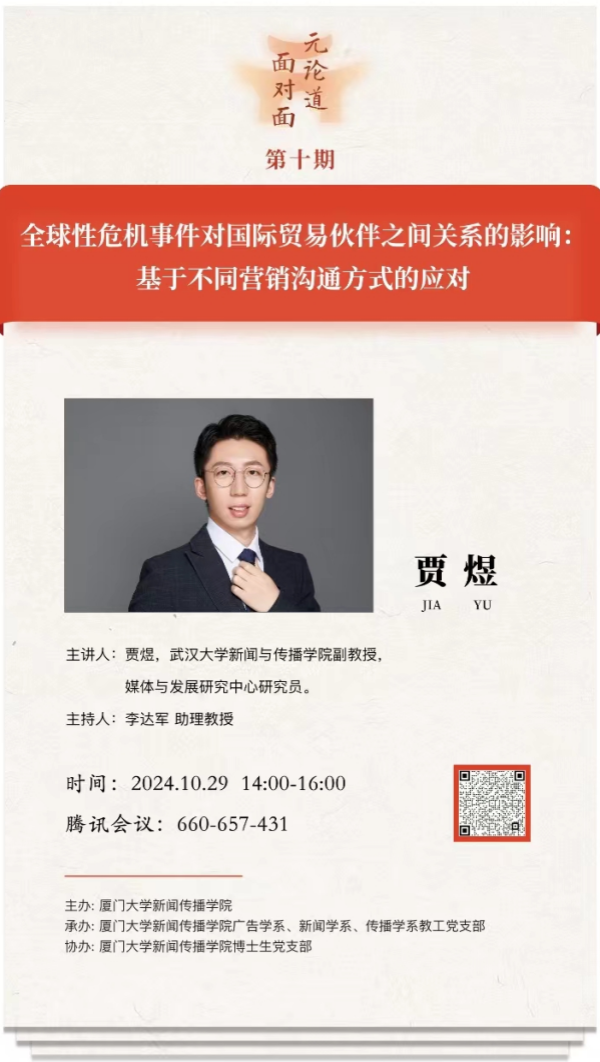10月29日,第十期“元论道·面对面”青年学术沙龙在线上成功举行。本期特邀武汉大学新闻与传播学院副教授、媒体与发展研究中心研究员贾煜,就“全球性危机事件对国际贸易伙伴关系的影响及营销沟通策略”进行深入探讨。活动由厦门大学新闻传播学院助理教授李达军主持,吸引了众多教师和研究生的热情参与。