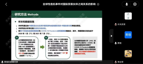 贾煜教授首先通过案例分析,阐述了全球性危机事件对国际贸易伙伴关系可能产生的影响,并提出了相应的假设。在研究方法上,他详细解释了样本和数据来源,并特别强调了采用COVID-19大流行档案数据的原因。贾教授指出,为了收集全面准确的数据,研究团队投入两年时间进行抽样调查,最终收集到197份有效问卷。针对可能的样本非响应性偏差,团队对比了最终样本与第二阶段推出的公司的主要特征差异,发现偏差并不显著。
