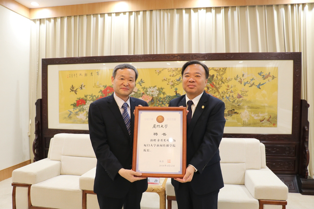 厦大党委书记张彦(右)为余清楚教授颁发院长聘书