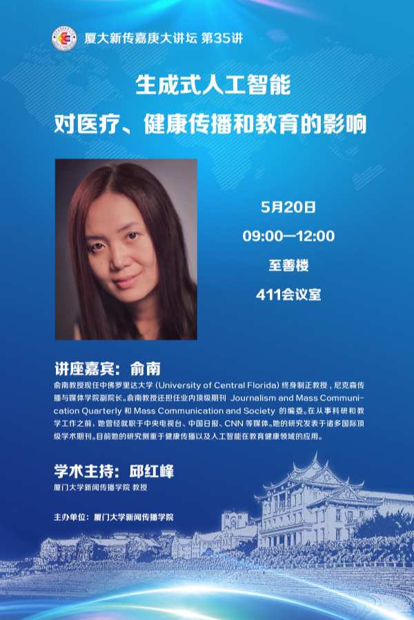 5月20日上午,中佛罗里达大学(University of Central Florida)终身制正教授、尼克森传播与媒体学院副院长俞南教授做客厦门大学新传嘉庚大讲坛,在至善楼411会议室作题为《生成式人工智能对医疗、健康传播和教育的影响》的精彩讲座。本次讲坛由传播学系系主任邱红峰教授主持。