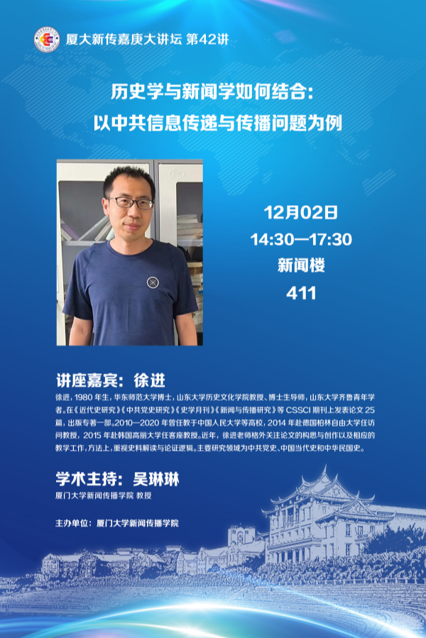 12月2日,山东大学历史文化学院教授、博士生导师、山东大学齐鲁青年学者徐进做客厦门大学“新传嘉庚大讲堂”第42讲,在厦门大学新闻楼411进行了题为《历史学与新闻学如何结合,以新闻舆论史、中共信息传递和传播问题为例》的讲座。本次讲座会议由厦门大学新闻传播学院吴琳琳教授主持。