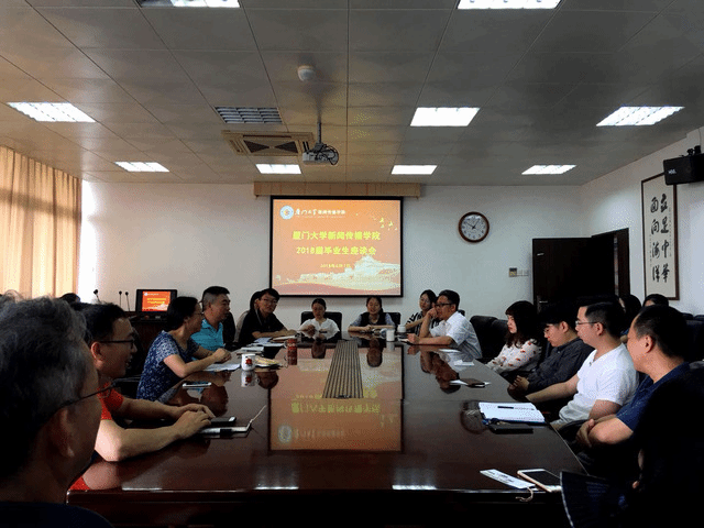 2018年6月7日,厦门大学新闻传播学院2018届毕业生座谈会在院楼411举行。党委书记郑树东、新闻传播学院常务副院长黄合水、新闻传播学院副院长林升栋、党委副书记黄辉,聂鑫、新闻学系系主任苏俊斌、广告学系系主任罗萍、研究生辅导员蔡笑霜、本科生辅导员张锡臻、林光洁以及新闻传播学院本硕博共20位学生代表参与座谈。大家就学院的人才培养,学生的实习就业等方面进行了探讨;即将毕业的学长学姐在座谈会上也分享了很多可供学弟学妹们借鉴的学习、就业方面的经验。