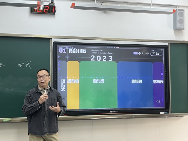 “时间”是贯穿此次讲座的线索。黄老师首先结合自己的新闻生涯,梳理了新闻行业过往30年的历史变迁。黄老师指出,未来仍是新闻人大有可为的好时代,因此更需要把握自己的好时机。年轻新闻人要在热爱的推动下不断尝试多种业务,加深自己对新闻行业的了解。