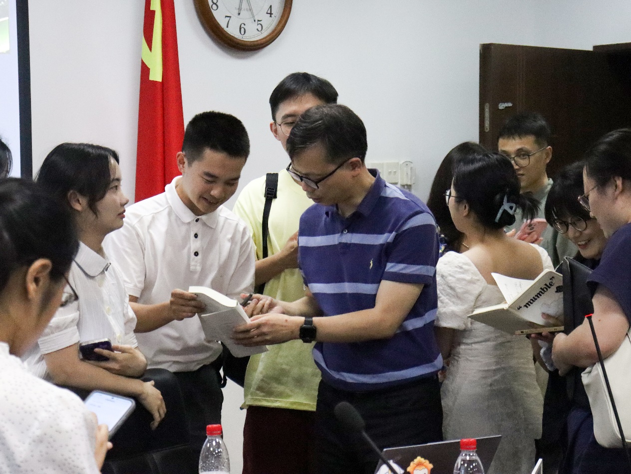 讲座尾声,邓建国与在场师生展开了热烈交流并合影留念。同学们就chatGPT使用的道德伦理、以及如何解决chatGPT的回答倾向于平庸等问题进行提问。邓建国指出AI伦理是技术伦理很重要的一个层面,他分别从chatGPT是否有意识、有情感和chatGPT是否拥有与人类平等的地位三个问题向我们阐释了如何正确地看待chatGPT的道德伦理问题。他指出我们在看待chatGPT雇佣非洲肯尼亚的语言训练师的问题上,在考虑技术是否带有剥削性的同时,需要倾听这些训练师的主观思想。同时他肯定了同学们关于chatGPT语法模式的想法,表示chatGPT是知识工作者的利器,它可以与我们产生互动,激发我们的灵感。但更重要的是,我们应学会如何使用chatGPT去完善我们的写作,而不是完全地依赖它。