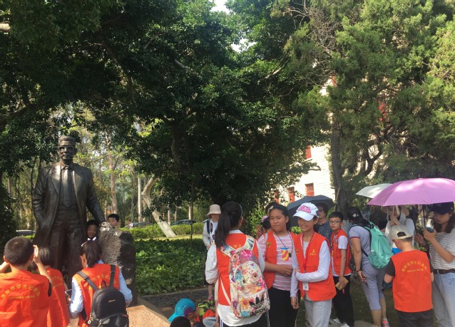 随后,志愿者带领小记者们参观了上弦场、李光前塑像和建南大会堂,并且对于沿路景观进行耐心的讲解,小记者们也听得十分认真,虽然天气炎热,太阳很晒,但是小记者们的兴趣和热情丝毫没有受到影响。