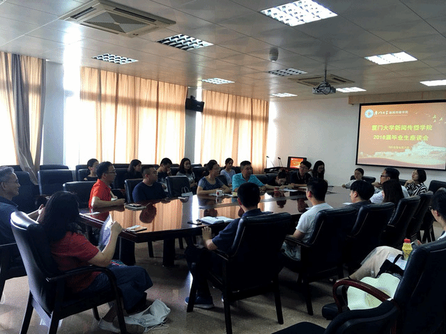 2018年6月7日,厦门大学新闻传播学院2018届毕业生座谈会在院楼411举行。党委书记郑树东、新闻传播学院常务副院长黄合水、新闻传播学院副院长林升栋、党委副书记黄辉,聂鑫、新闻学系系主任苏俊斌、广告学系系主任罗萍、研究生辅导员蔡笑霜、本科生辅导员张锡臻、林光洁以及新闻传播学院本硕博共20位学生代表参与座谈。大家就学院的人才培养,学生的实习就业等方面进行了探讨;即将毕业的学长学姐在座谈会上也分享了很多可供学弟学妹们借鉴的学习、就业方面的经验。