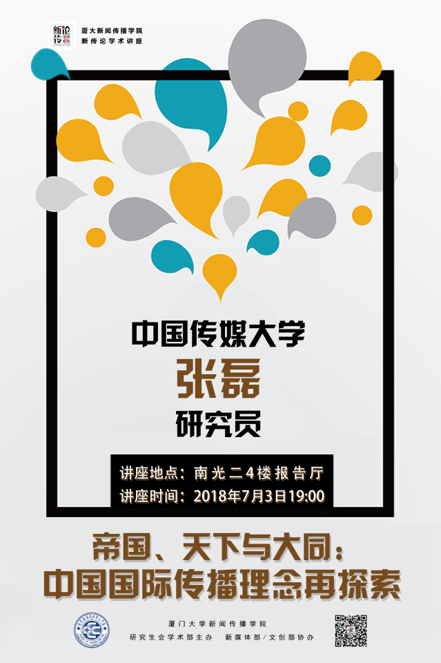 讲座人:张磊。中国传媒大学国家传播创新研究中心(教育部人文社科重点研究基地)研究员、博士生导师。主要研究领域为:文化研究、媒体人类学、传播学理论、国际传播等。担任中国传媒大学中外人文交流宣传研究中心执行主任。担任《国际传播》期刊编辑部副主任,Global Media and China期刊的总编助理。著有《焦虑与希望:对北京城市贫困群体的传播社会学研究》(中国广播电视出版社:2010)、《传播学总论》(第二版,第三作者,清华大学出版社:2008)等,译著包括《媒介与传播研究方法》(中国传媒大学出版社:2018)等。在国内外学术期刊发表论文四十余篇。曾赴美国宾夕法尼亚大学安南堡传播学院(2005)、香港城市大学媒体与传播系(2009)、英国伦敦大学金史密斯学院(2011)担任访问学者。