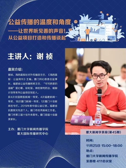 11月25日,由厦门大学新闻传播学院、厦门大学国际传播研究中心共同举办的第45期厦大新闻学茶座,在至善楼411会议室举行。本次讲座的主讲者为海西晨报社对外传播部主任、《海西晨报・公益周刊》主编谢祯,他同时也是厦门同心慈善会监事长、福建省公益传播班班主任。茶座由厦门大学新闻传播学院曹立新副教授主持。