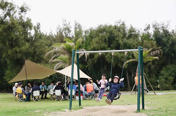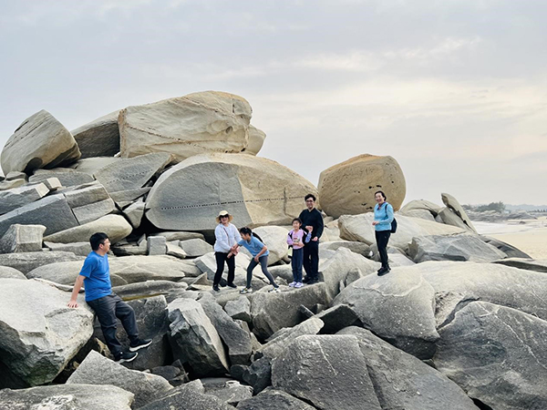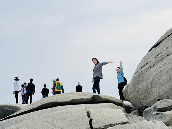 结束古卫城的知识探寻之旅后,老师们来到此行的第三站——军事公园的黄金海岸。喜欢休闲之旅的老师们围坐在海边的天幕下泡茶聊天,而另外一部分喜欢踏浪的老师们则漫步奔向大海边,同时发出“这沙子好细啊!”“这沙子好白啊!”的感叹和体验。大家先后不约而同地爬到造型奇特的天然礁石上,看浪花朵朵,看海天一色,感受着徐徐的海风拂面,在欢声笑语中放空心情和放松交谈,充分感受大自然的鬼斧神工,并留下了许多美丽照片的美好情景记忆。