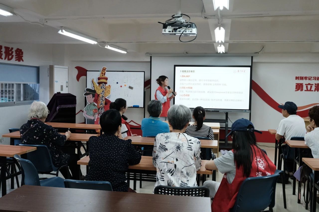 活动中,吴奶奶一边学习着操作Deep seek一边感慨道:“退休后总觉得跟不上时代,但今天学会了用AI,感觉自己又和社会‘接轨’了!”唐叔叔兴奋地说:“原来生活中这么多问题都可以问DeepSeek!查菜谱、问天气、防诈骗……以前觉得AI很高深,现在发现它就像个耐心的‘小老师’。”贺阿姨也笑着分享她的收获:“平时我也用DeepSeek,但今天才知道,原来和AI对话可以加上‘我是老年人’‘请回答简短些’这样的提示语,让它更懂我们!”这次活动让我们看到,科技的温度不在于它有多先进,而在于它如何真正走进老年人的生活,帮助他们跨越数字鸿沟。未来,我们希望能继续陪伴他们,在智能时代里找到属于自己的便利与快乐。