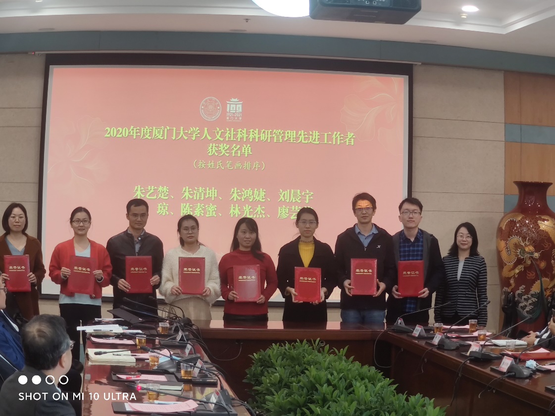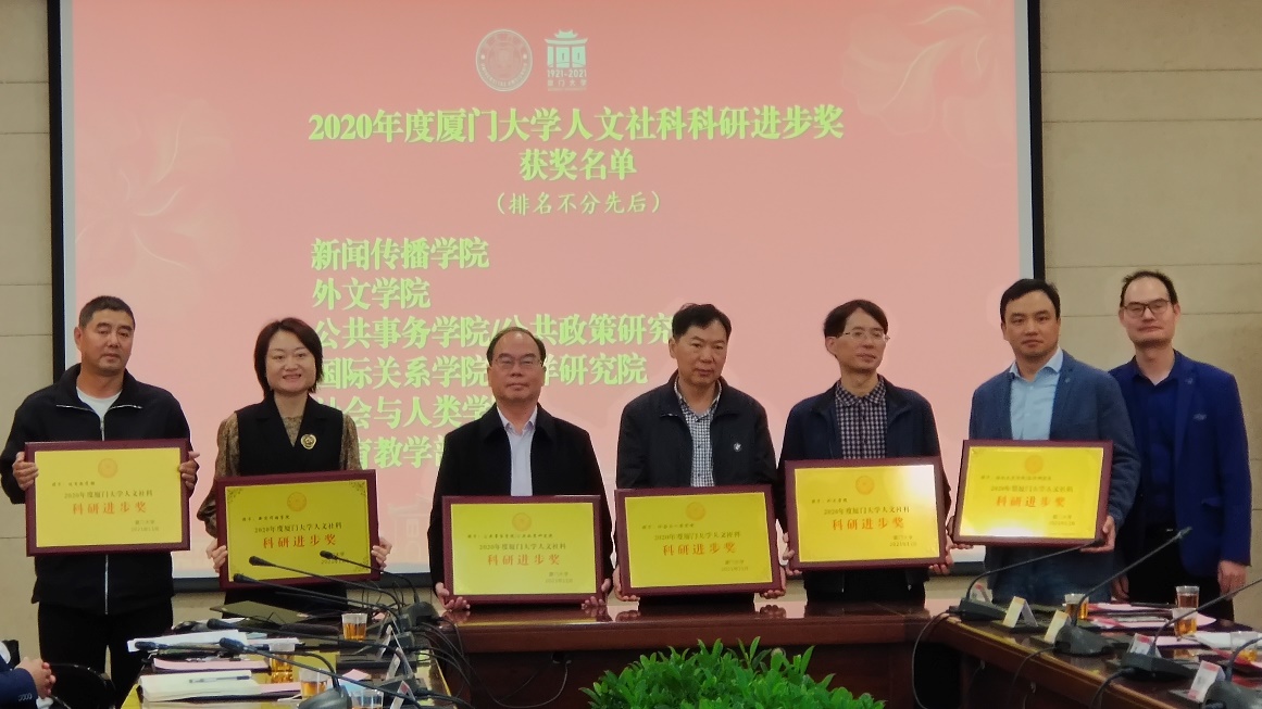 会议举行了厦门大学文科实验室授牌仪式,表彰了2020年度人文社科科研业绩突出单位和个人。我院国际新闻与战略传播数据实验室获批厦门大学文科实验室,我院获评“2020年度厦门大学人文社科科研进步奖”,我院教师陈嬿如、宣长春获评“2020年度厦门大学人文社科科研业绩突出个人”,林光杰获评“2020年度厦门大学人文社科科研管理先进工作者”。校长助理方颖、社科处处长高和荣等为文科实验室负责人、受表彰的单位及个人代表颁奖。