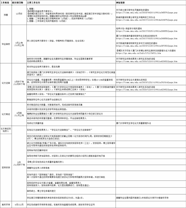 2. 申请提前毕业的研究生,须先取得研究生院批复同意,方可与高一年级人员一同安排毕业(学位)论文送审、论文答辩以及相关毕业事宜。提前毕业工作可见研究生教育手册内《厦门大学研究生申请提前毕业实施办法》【(2023)厦大研50号】。提前毕业申请需在学校指定受理期限内,通过教务服务平台“提前毕业”应用提交并请导师审核。提前毕业资格院级材料审核的截止时间为每年3月15日及9月15日(如上述时间点为周末则提前至临近的工作日)。申请人应自行了解【工作规范】厦门大学新闻传播学院研究生申请提前毕业实施办法(2019年修订)-新闻传播学院所须满足的申请条件。为达到相关条件,论文定稿提交前的有关环节较正常学制毕业人员应有所提前(如,毕业学分审核工作、创新性成果的取得、预答辩的执行均应在院级审核截止前完成),即工作环节的截止时间不适用一般情况,采集方式可以参照。
