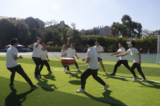 “一、二、三!”八位老师每人牵拉着绳子的一端,另一端系在中心的红色同心鼓上,捡球员把球放在鼓面上,老师们齐心协力让球面上颠起,这个比赛是对默契和耐力的双重考验。