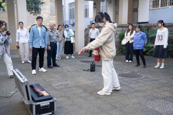 随后进行的灭火实操环节,实验中心曾祥健老师为大家演示消防器材的适用范围与操作要领,师生分批上前,利用实验与设备管理处提供的模拟灭火系统,学习熟练灭火技能,大家均能够按照“提、拔、握、压”四步法操作灭火器,成功扑灭初期火情。大家在反复尝试中不仅熟悉了消防器材的使用方法,更在紧张、专注与成就感的交织中,深刻体会到了面对火情时应急处置能力的重要性。