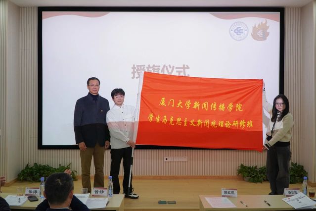 赖虹凯为“马新班”第八期、第九期授班旗,并作讲话。他对“马新班”取得的成绩和荣誉表示祝贺,嘱托同学们充分利用“马新班”提供的学习实践机会锻炼自己。他强调,同学们要筑牢理想信念,用马克思主义新闻观武装头脑,坚持党性与人民性,成长为合格的新闻舆论工作者。他结合自己的学习经历,向学员们阐释了实习实践的重要性,勉励同学们勤观察、勤思考、勤动笔,把握新闻传播的规律,提高自己的专业素养。最后,赖虹凯鼓舞学员们坚持守正创新,肩负起厦大学子促进中华文化海外传播的使命担当,增强中华文明的传播力和影响力,在中国式现代化建设中挺膺担当,奉献青春。