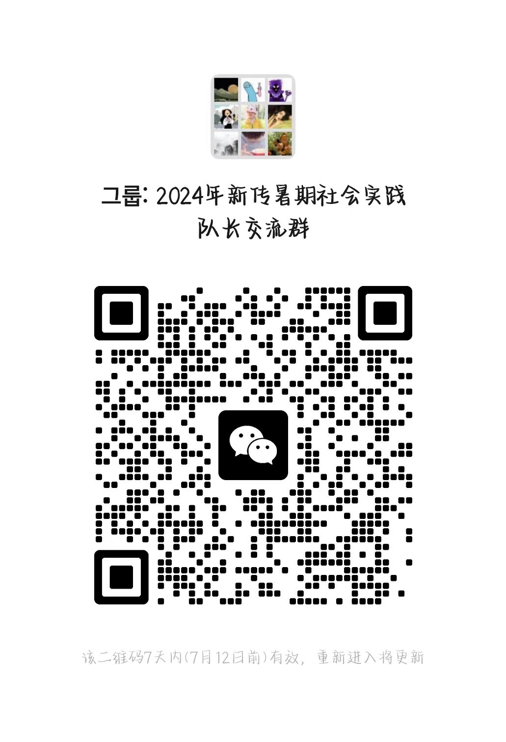4.请各位队长及时加入微信群“2024年新传暑期社会实践队长交流群”,群二维码如下,每支队伍只需队长加入,入群请将群昵称改为“队伍名称+负责人姓名+联系电话”。有任何问题及时在微信群中提出。
