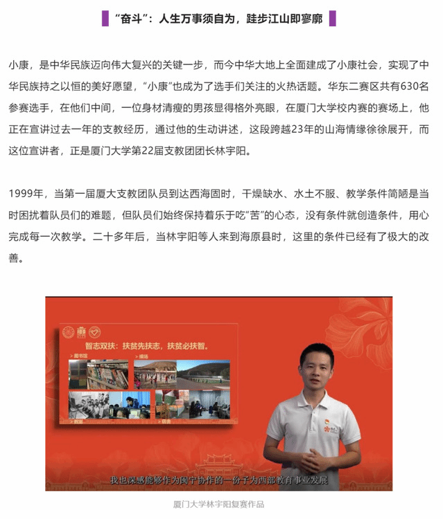 林宇阳在决赛中分享了奔赴宁夏“西海固”地区进行教育扶贫、乡村振兴的难忘经历。在决战决胜脱贫攻坚的收官之年,他担任厦门大学第22届研究生支教团先锋党支部书记、支教团团长,带领队员们从鹭江之滨奔赴黄土高原,将丰富知识和时代脉动带给大山里的孩子们,播撒希望的种子,唤醒拼搏的激情。在坚持立德树人、立足教育教学主责主业的同时,林宇阳和支教团成员累计筹集善款超110万元,在央视《开学第一课》、《晚间新闻》分享支教故事。林宇阳个人曾获厦门大学通报表扬、全国西部计划优秀志愿者等荣誉。