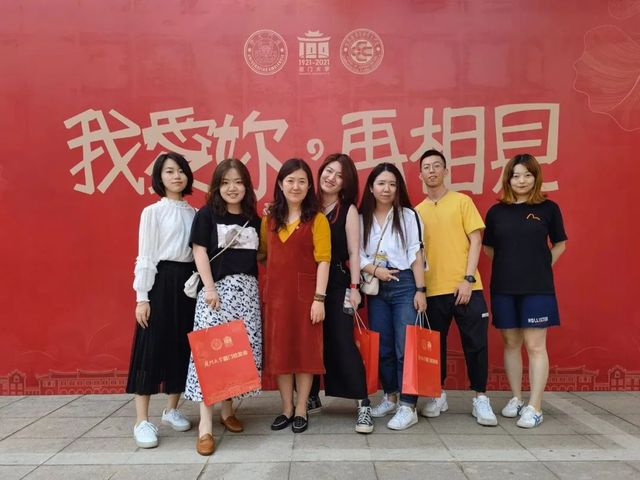 多名毕业生与迟月利老师(左三)拍摄于2021年,厦门大学百年校庆