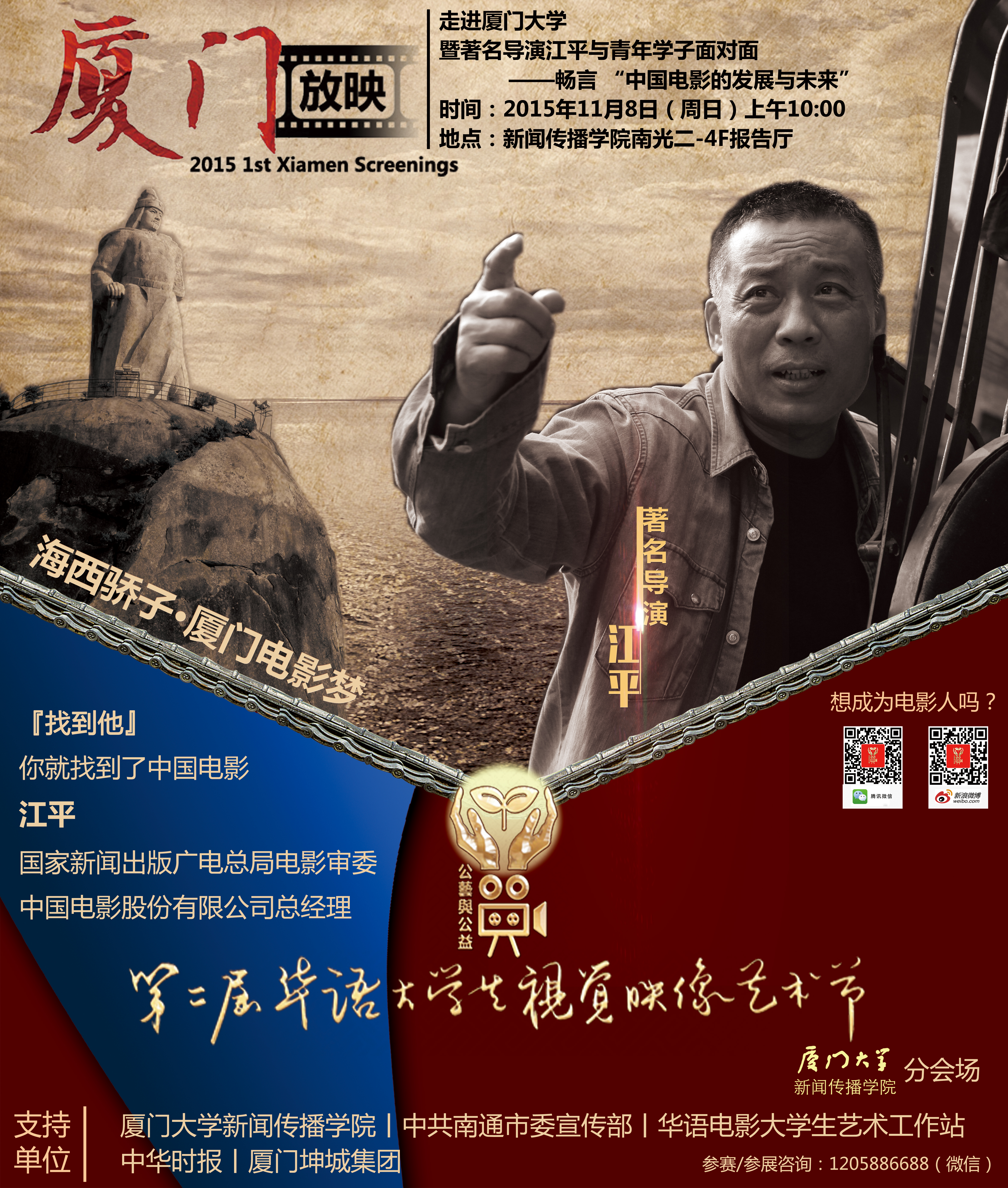 恰逢第二届华语视艺节在厦门设立首个“厦门放映”项目之机,11月8日上午,国家一级导演、国家新闻出版广电总局电影审委、中国电影股份有限公司总经理、第二届华语视艺节评委会主席江平先生为厦门大学师生带来了一场生动非凡、...