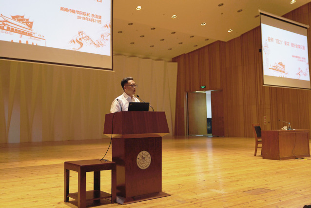 6月21日下午,新闻传播学院院长余清楚在科学艺术中心音乐厅为全院师生作题为“按照‘四力’要求,做好全媒记者”的讲座。讲座由新闻传播学院党委副书记黄辉主持。讲座开始前,大家集体观看了“新鲜出炉”的新闻传播学院《...