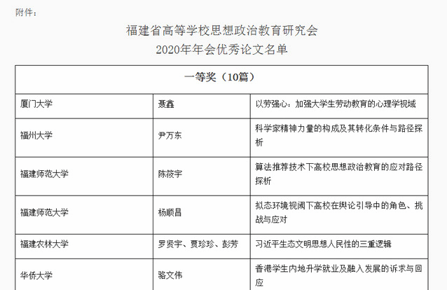 近日,福建省高等学校思想政治教育研究会公布了2020年年会优秀论文评审结果,学院党委副书记聂鑫老师的论文《以劳强心:加强大学生劳动教育的心理学视域》荣获一等奖。 该论文从马克思主义劳动教育观出发,...